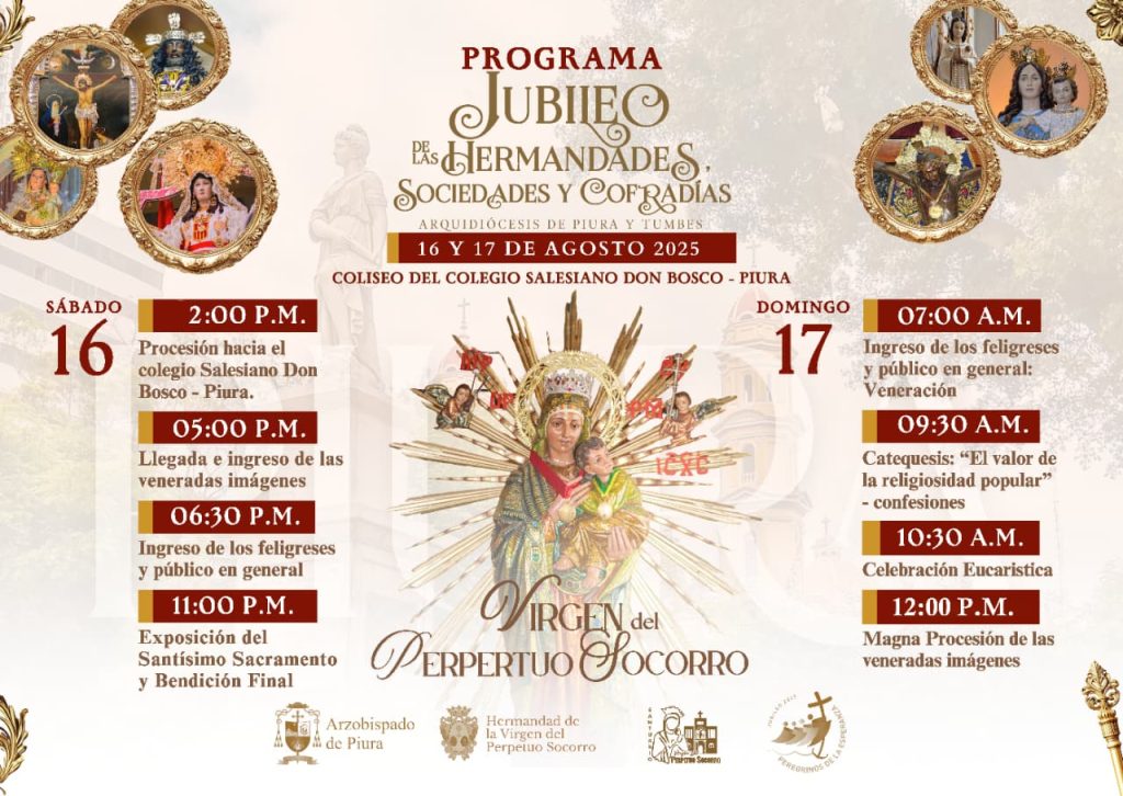 El evento contará con la presencia de la venerada imagen de la Virgen del Perpetuo Socorro, cariñosamente conocida por los piuranos como la “Morena de Oro”, quien dejará su Santuario, junto con su Hermandad, para reencontrarse con sus innumerables devotos, así como de otras emblemáticas advocaciones marianas y cristológicas provenientes de diversas parroquias y comunidades de Piura y Tumbes. Junto a estas sagradas imágenes, como: la Virgen de las Mercedes de Paita, la Virgen Rosa Mística de Tumbes, el Señor de la Buena Muerte de Chocán, el Señor Cautivo de Ayabaca, la Virgen del Carmen, el Señor de los Milagros de Piura y María Auxiliadora, son devociones profundamente arraigadas en la piedad popular, y serán protagonistas de procesiones, celebraciones litúrgicas y actos jubilares que renovarán la vida espiritual de la comunidad.